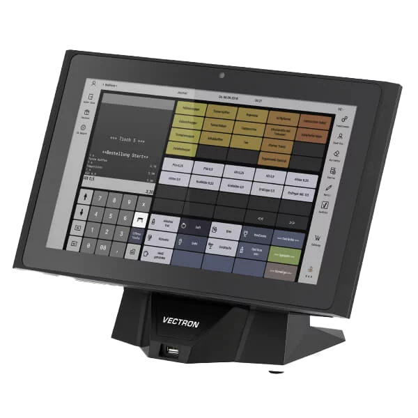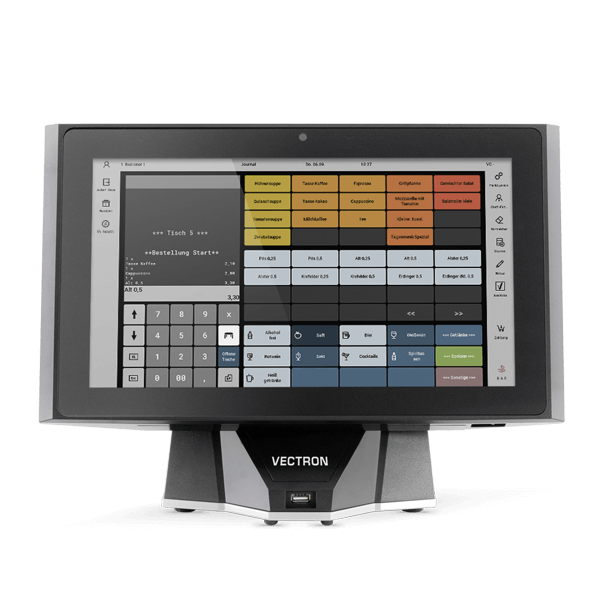 Des gestes de balayage et un toucher intuitifs de l'écran capacitif de 35,8 cm contrôlent le système d'encaissement Vectron POS Touch 14 Wide. Le panneau de commande à écran large robuste et résistant aux rayures de la caisse fixe est étanche à la poussière et à l'eau et intégré dans un cadre avec rétroéclairage LED.